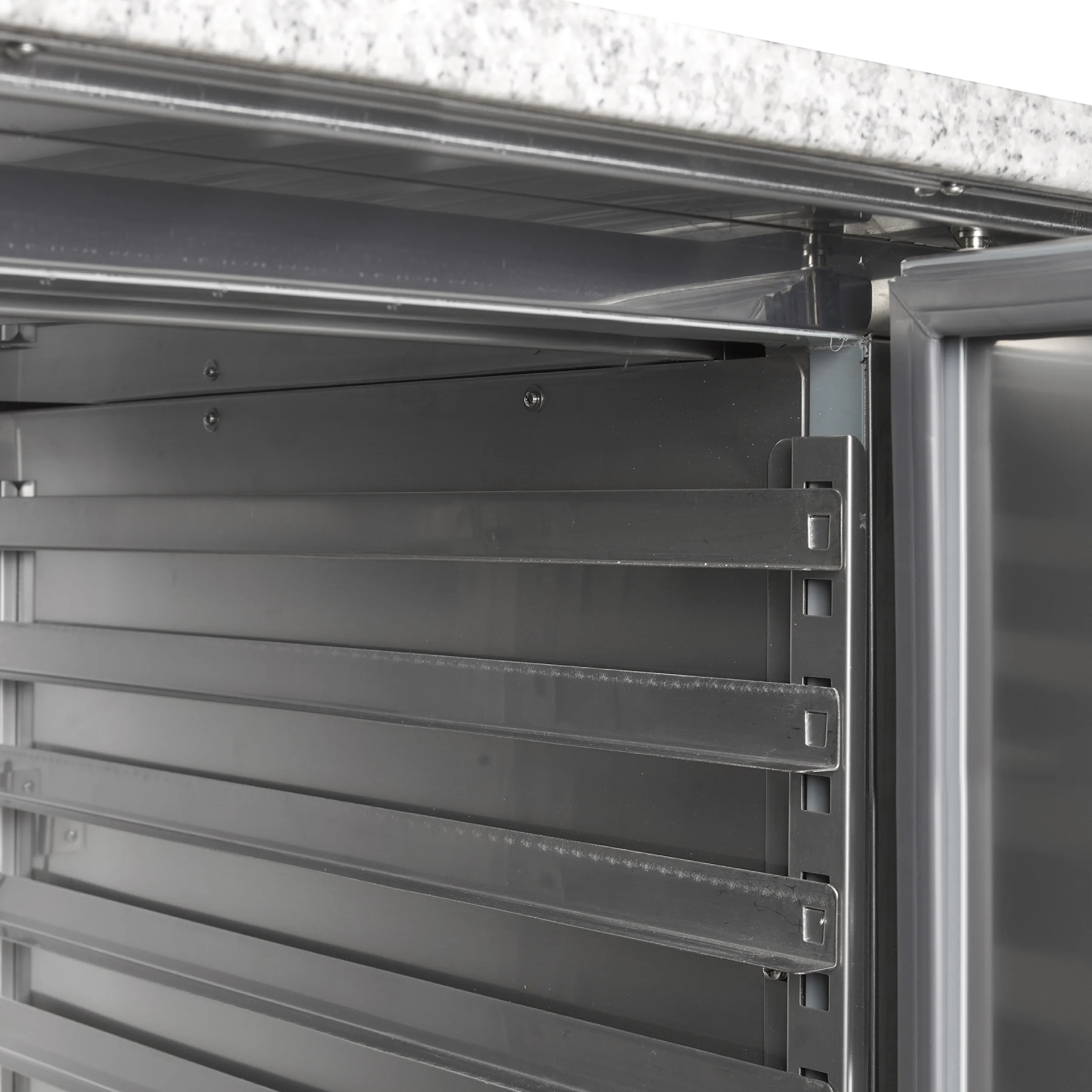 Roestvrij staal|Geleiders voor 7 pizzaplaten per deur (400×600 mm)|Granieten werkblad|Geventileerde koeling|Automatisch ontdooien|Zelfsluitende deuren|Stelpoten