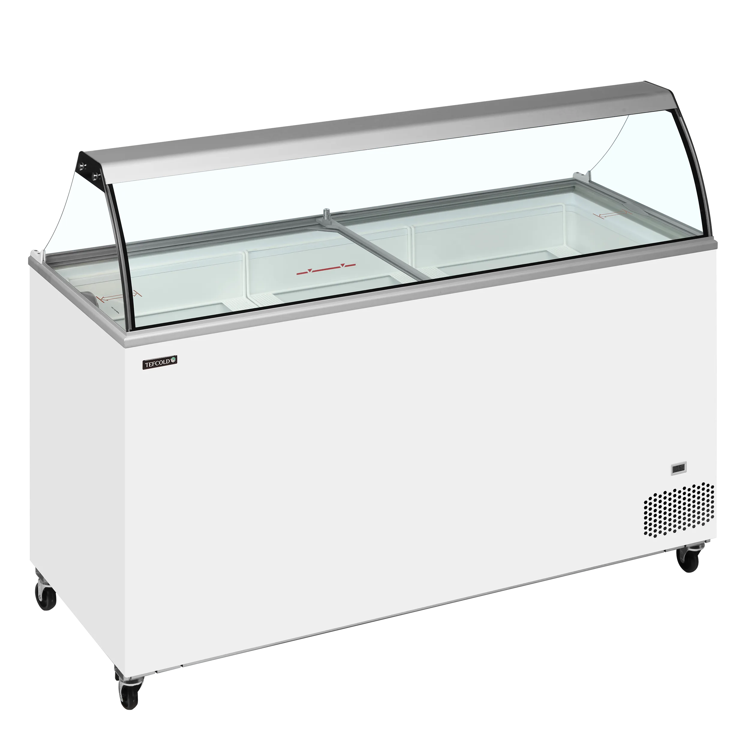 Niesbescherming in gebogen glas|Platte schuifdeksels met slot|Opslag onder de bakken|Uitstekende mogelijkheden voor branding|LED-binnenverlichting|Zwenkwielen met rem|Digitale thermometer|Optioneel – Schepijsmand voor plastic bakken|Klimaatklasse 5 voor krachtige prestatie in warme omgevingen